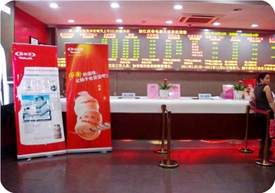 售票處的醒目的養(yǎng)樂多易拉寶